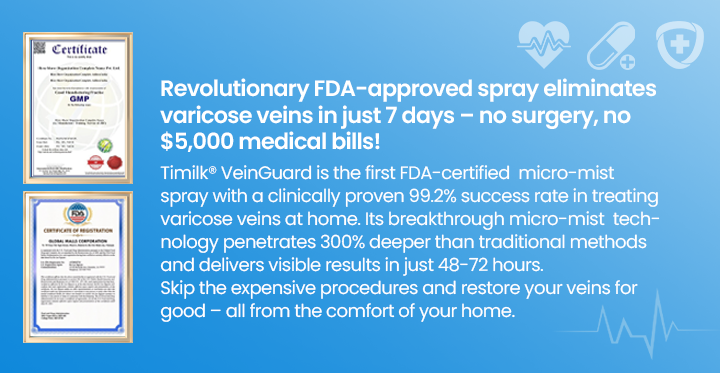 画期的なFDA承認スプレーが、わずか7日間で静脈瘤を解消 – 手術不要、5,000ドルの医療費も不要! Timilk® VeinGuardは、家庭での静脈瘤治療において臨床的に証明された99.2%の成功率を誇る、初のFDA認証マイクロミストスプレーです。画期的なマイクロミスト技術が従来法の300%の浸透力を実現し、わずか48~72時間で目に見える効果を発揮。高額な施術は不要、自宅で快適に静脈を永久に改善します。